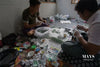 A young man draws out dye concentrates into cups from the mixing station.