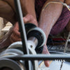 The driller pulls down on the handle placing just enough pressure onto the slab that sits securely underwater.
