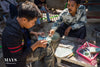Once the Jadeite is in manageable slabs, workers draw outlines of bangles onto them. It's an important step, taking in to consideration these three factors: size, flaws and wastage. They would have to fit the maximum amounts of bangles on any given slab with the minimum amounts of flaws therefore, reducing wastage.