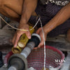 The rough bangles are ready to be hand carved into the desired styles: round, semi-round, half-moon or flat. The technique uses two halves of a tough-gritted diamond flat lap to shape the rough bangle into style while its mounted on a spinning spindle.