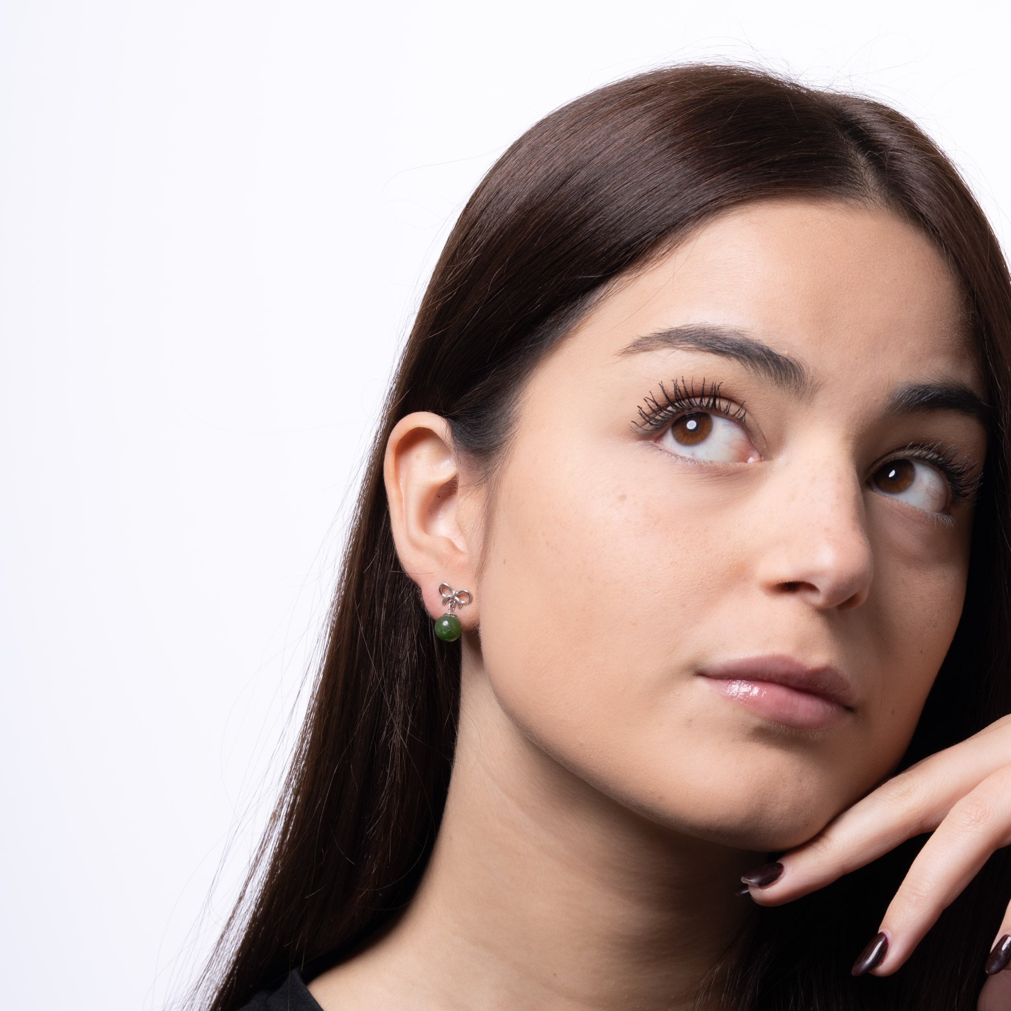Delicately feminine and timeless, these sterling silver bow earrings feature natural green nephrite jade drops that bring a touch of elegance to any outfit. Each earring is crafted from solid 925 sterling silver and designed with a graceful bow motif.